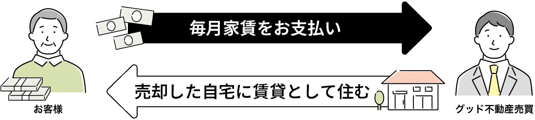 現在所有していらっしゃる不動産を一旦売却した後、以後はリース(賃貸)という形をとり、新所有者に毎月家賃を支払うことで、売却後も引っ越す必要もなく、そのまま住み続けられるサービスです。